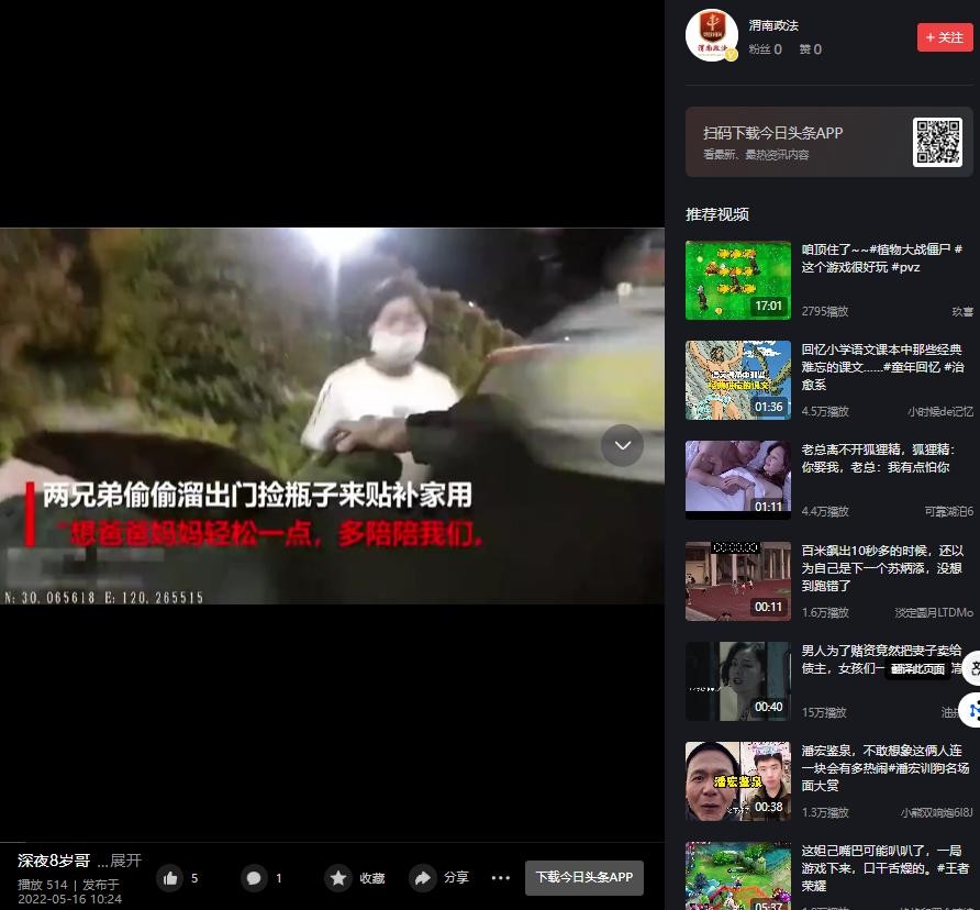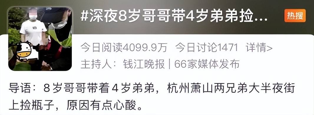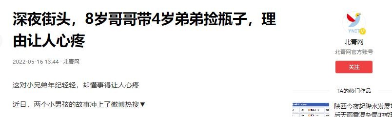 信息来源:北青网2022-5-16 深夜街头,8岁哥哥带4岁弟弟捡瓶子,理由让人心疼