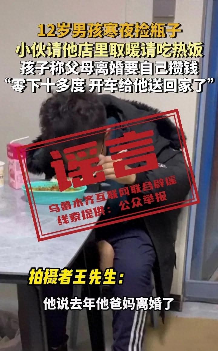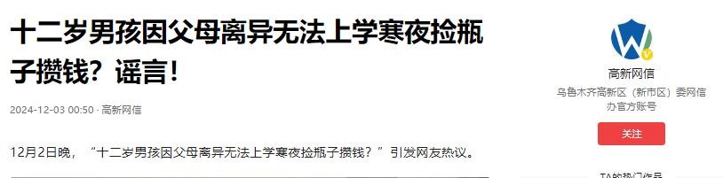 信息来源:高新网信2024-12-3 十二岁男孩因父母离异无法上学寒夜捡瓶子攒钱?谣言!