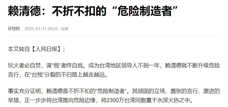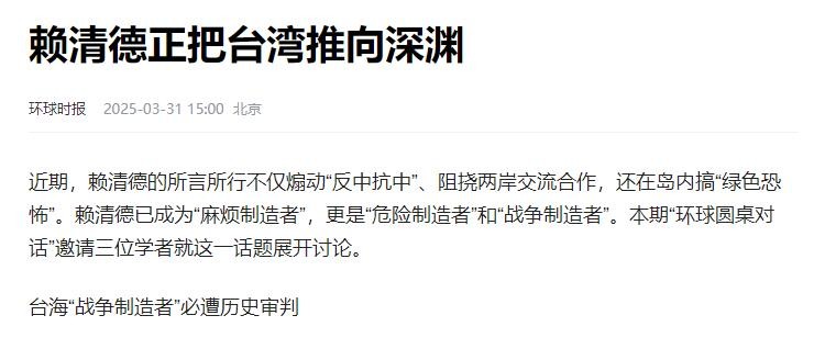 信息源:赖清德正把台湾推向深渊 环球时报 2025-03-31