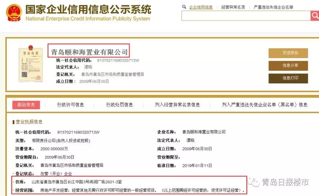 青岛日报楼市记者从“国家企业信用信息公示系统”调查发现,青岛颐和海置业有限公司成立于2009年06月30日,法定代表人为谭晓,注册资本2000万。对于业主们反映的延期交房问题,记者致电颐海蓝湾售楼处,截止发稿时无人接听。另据业主称,此前有其他媒体记者曾经电话联系到过青岛颐和海置业有限公司第一任法人代表焦学敏,但是当记者表明身份后对方挂断了电话。