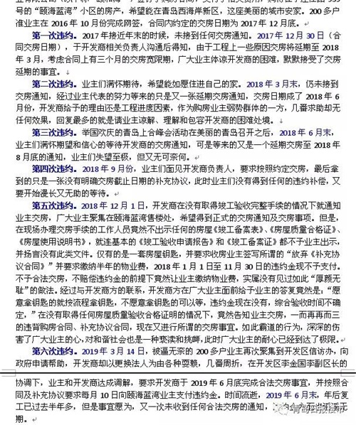 青岛颐海蓝湾开发商6次违约一再延迟交房,200多户业主无奈求帮助