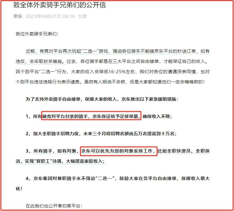 今早京东发布了一份《致全体外卖骑手兄弟们的公开信》,开头就是直捣黄龙式的王炸,表示: