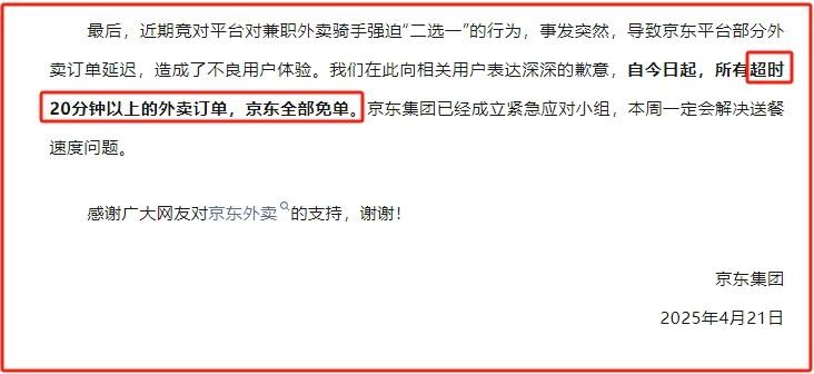 在京东《公开信》的最后,京东表示自今日起,所有超时20分钟以上的外卖订单,京东全部免单。