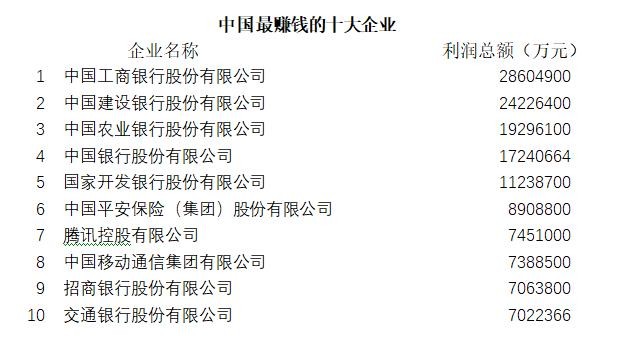 打开利润总额前10名的企业榜单,上榜企业依次为:工商银行、建设银行、农业银行、中国银行、国家开发银行、中国平安、腾讯、中国移动、招商银行和交通银行。