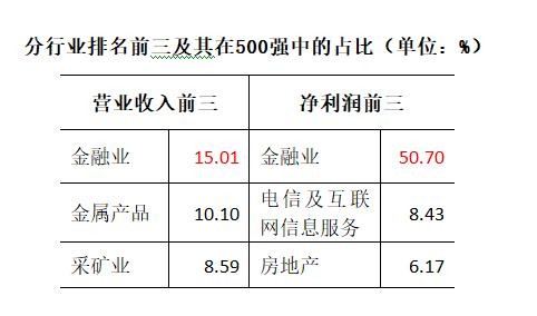 另外,引人关注的是,尽管金融业入围企业仅33家,但却在营收、净利润、资产等7个指标上高居细分行业之首。金融企业占全部500强净利润的50.7%,其中有17家银行占全部净利润的43.4%,而在资产和海外资产上,金融企业占比超全部500强企业的60%。