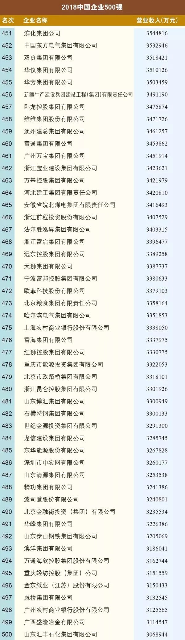 “2018中国企业500强”入围门槛首次突破300亿元大关,实现了16连升。这前三甲还是国家电网、中国石化和中国石油,这第500名幸运儿则是成立于1997年的山东汇丰石化集团有限公司。