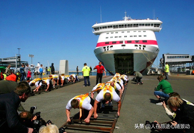 2011年5月20日,在爱沙尼亚塔林,20名大力士用绳索拖着2万吨邮轮“波罗的海女王”号行进10米,一举创下吉尼斯世界纪录。