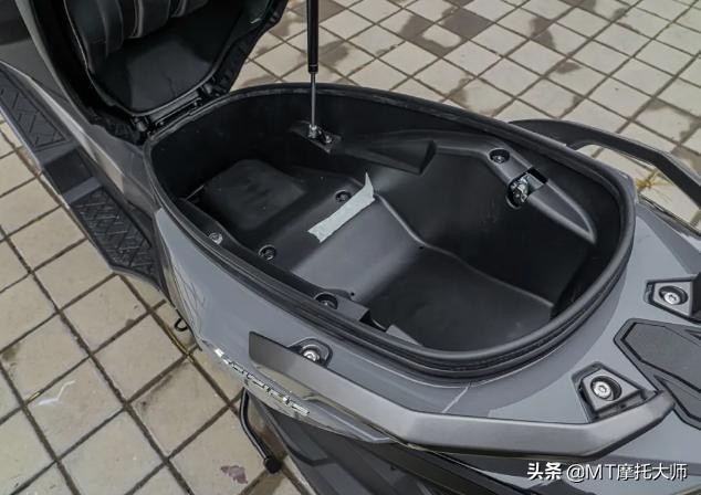 在实用性方面,这款车的座下空间也是非常大,容积可以容纳一顶标准规格的3/4全盔,半盔几乎都能够放下,并且还可以放一些日常杂物。同时座下储物箱还有照明灯和液压支撑杆,细节方面处理得非常到位。