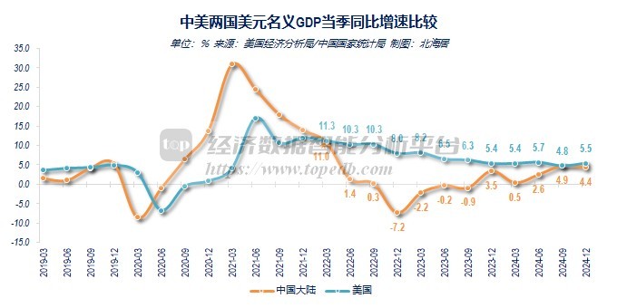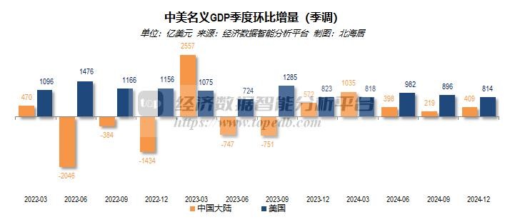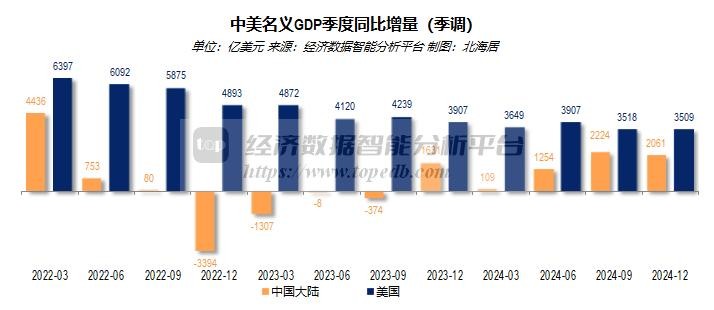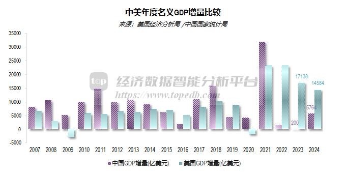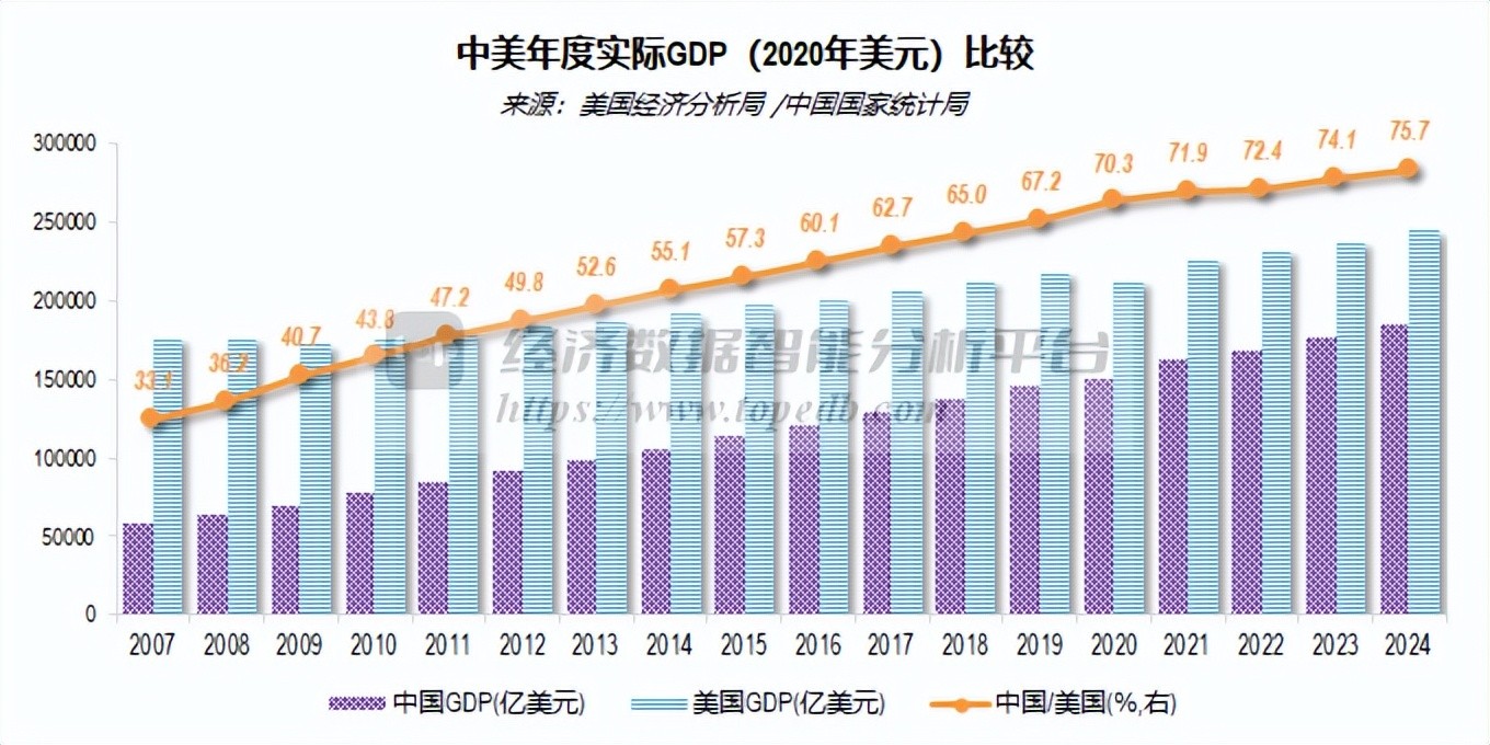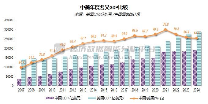 2024年,中国大陆名义GDP规模降至美国的64.9%,较上年降低了1.34个百分点,比高峰时(2021年)降低了11.91个百分点。