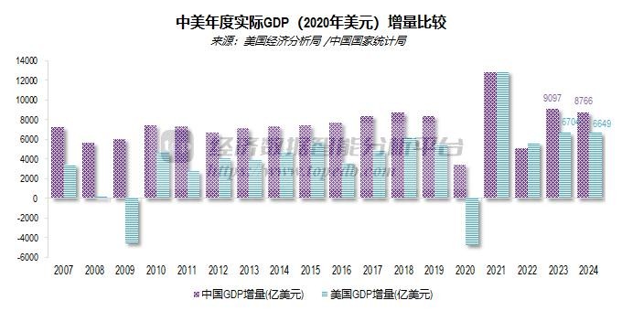 2024年,按2020年不变价美元计算,中国大陆实际GDP规模达到美国的75.7%,比上年提高了1.6个百分点;中国大陆实际GDP增量为8766.07亿美元,美国实际GDP增量为6648.98亿美元。
