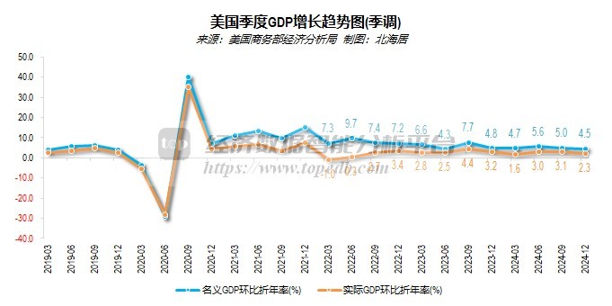 2024年,按2017年链式美元计算,未经季节调整,美国名义GDP先行估算值为23.32万亿美元,同比增长2.86%,增加6483.61亿美元;经季节调整后,美国实际GDP先行估算值为23.30万亿美元,同比增长2.8%,增加6310.67亿美元。