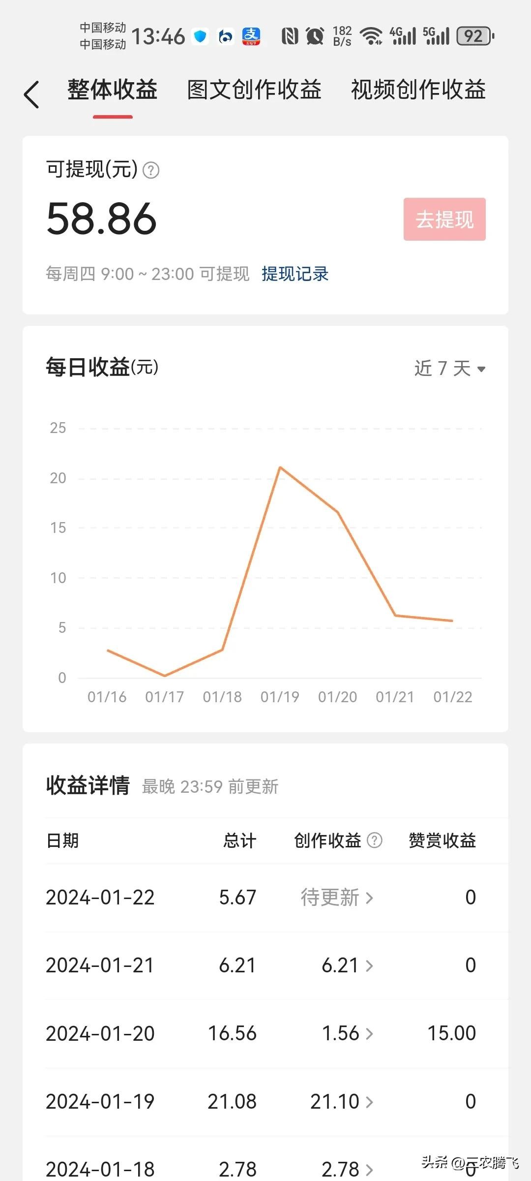 今日头条写作6.21元,记录前天的收入,依次类推。