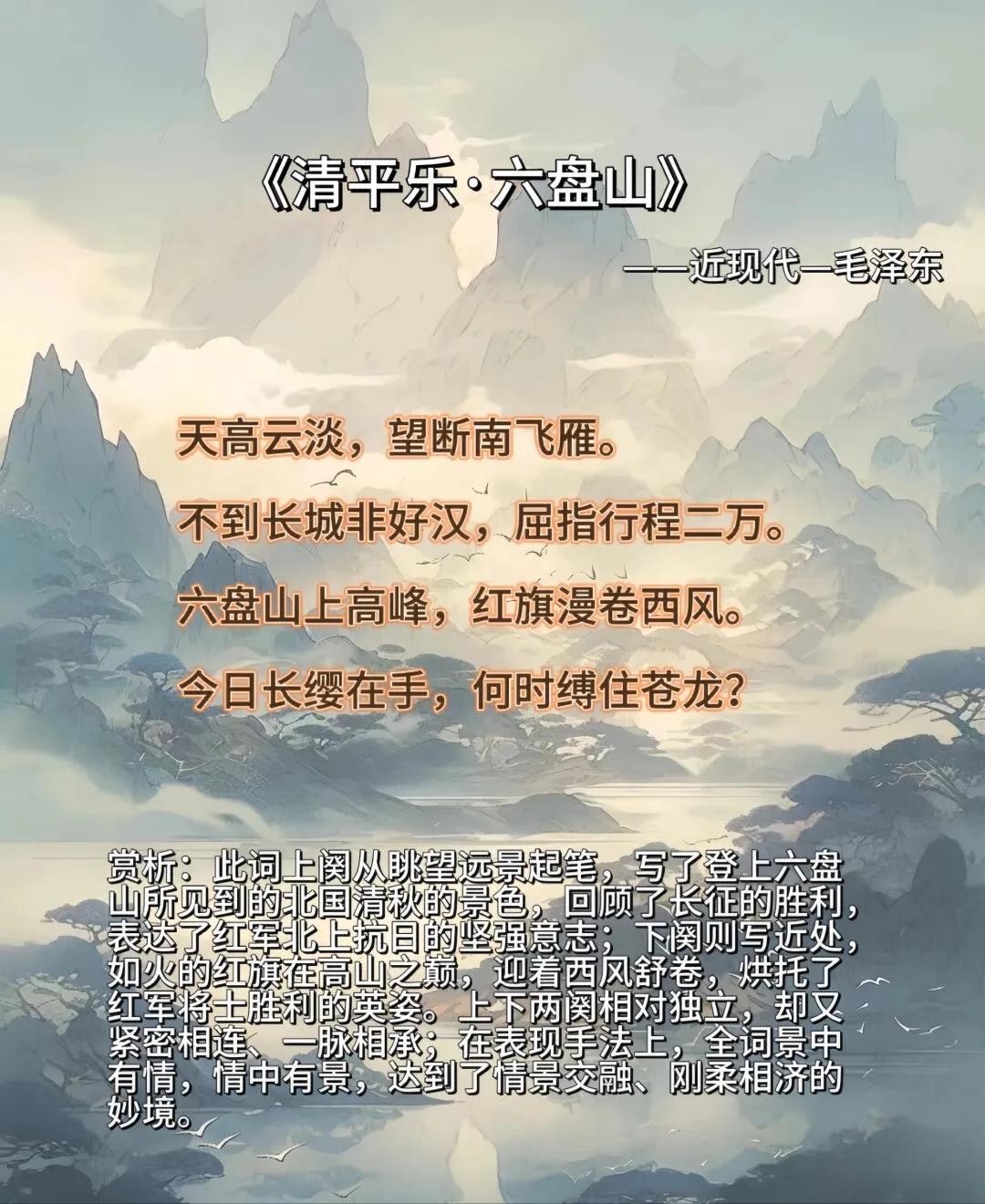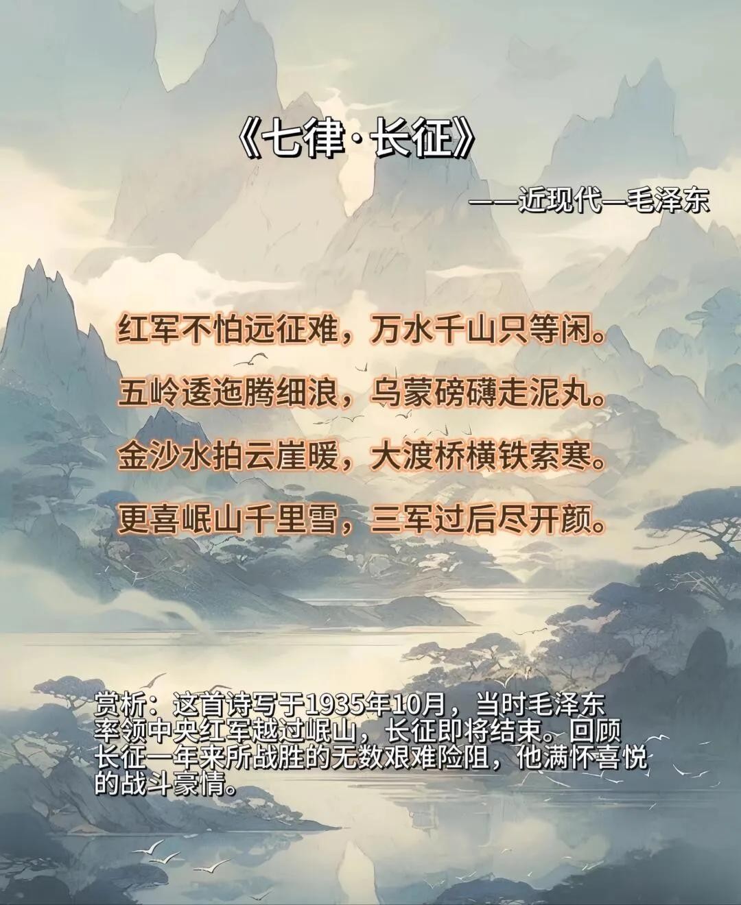 长征始于1934年10月红军撤出江西瑞金,结束于1936年10月红军三大主力会师。在这两年的时间里,中国共产党领导的工农红军,粉碎了国民党的围追堵截,翻过了雪山,走过了草地。两年内辗转走过14个省份,终于相继三大主力会师,从此建立了革命根据地,使中国革命转危为安。长征过程中遇到的艰险与众人乐观的精神,可以从下面10首长征的诗词中感受。长征精神直到今天仍然影响着一代又一代的新时期青年,鼓舞人们艰苦卓绝地创造出属于自己的价值。