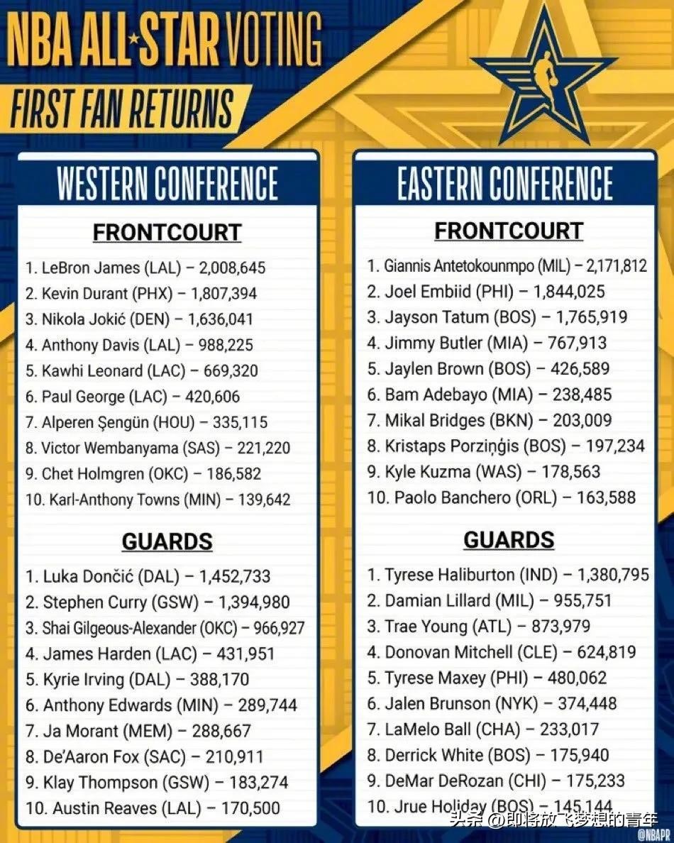 今天,NBA官方公布了本赛季全明星第二轮投票结果,详情见上图。
