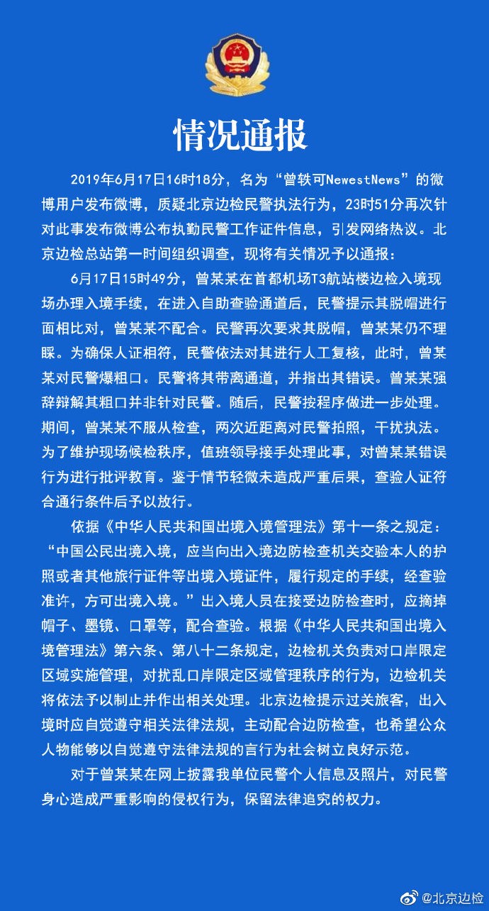 今早北京边检通过微博通报曾轶可拒绝接受边检的情况,紫光阁、共青团中央、国家移民管理局、人民日报、央视新闻等国家机构和央媒,都接连发布或转发微博,点名批评曾轶可的行为。其中国家移民管理局发布微博写到:“让执法者腰杆更硬,让守法者心里更暖 。国门神圣,法律庄严!”