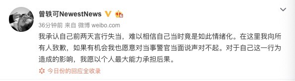 曾轶可道歉了:承认言行失当,工作或将暂停