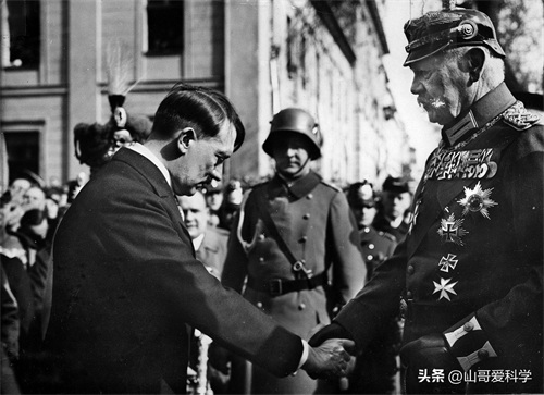 阿道夫·希特勒,一只披着羊皮的狼,卑躬屈膝地站在德国总统保罗·冯·兴登堡面前。一些德国政治家认为可以控制希特勒,因此在1933年说服兴登堡任命这位纳粹领导人为德国总理。不久之后,阿尔伯特·爱因斯坦便逃离了德国。