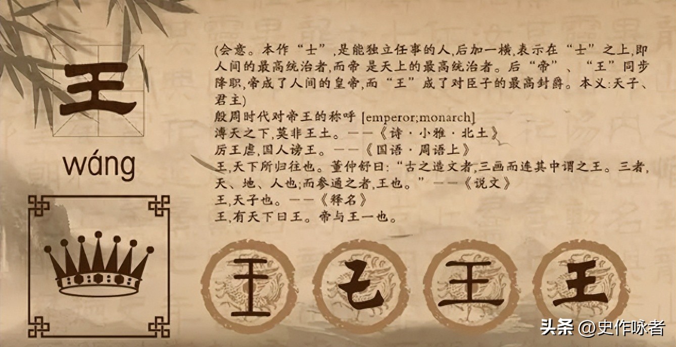 王姓发端于远古的姬姓,是商周时期的皇室专用姓氏,周朝覆灭后,许多王族为避祸改姓王氏,他们既可纪念自己的王族血统,又可保全性命,这成为王姓最初的重要来源之一。