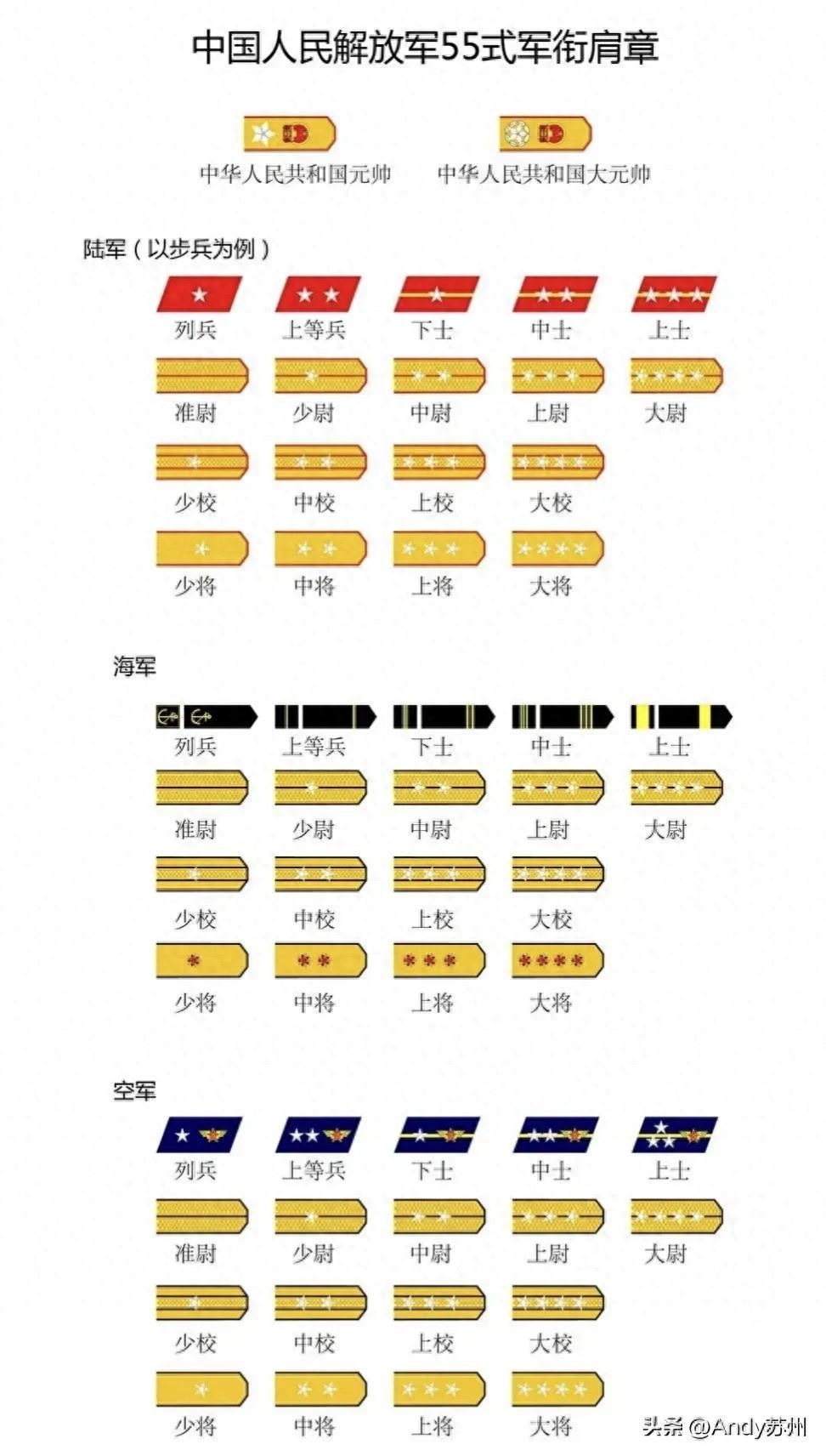 这里要注意一点,55年的军衔,准尉及以上军官是肩章领章俱全,准尉以下的士官及士兵,则是领章(海军除外,海军士官及士兵也有肩章)。