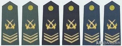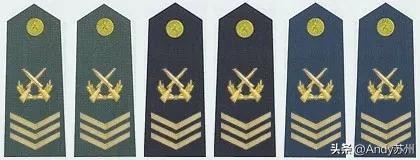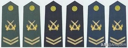 士兵和士官的军衔标识也从直杠变成了V型拐,同样以粗细和数量来区别。其中士官级别的军衔上多了个双枪交叉的军衔标识。
