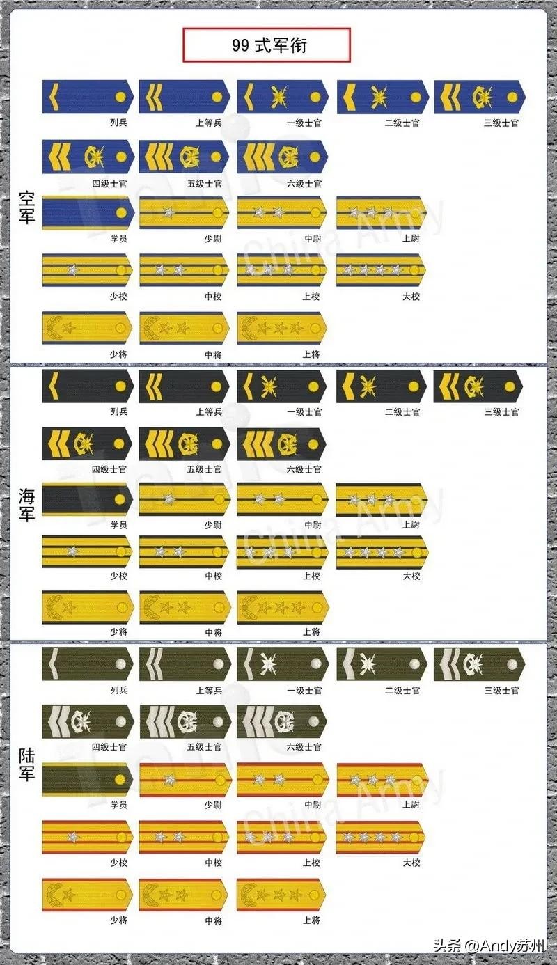 99式军衔,没有了一级上将军衔,上将军衔成为最高上限。军官军衔肩章没有什么改动。但是士官和士兵的军衔标识则做出了相当大的改动。