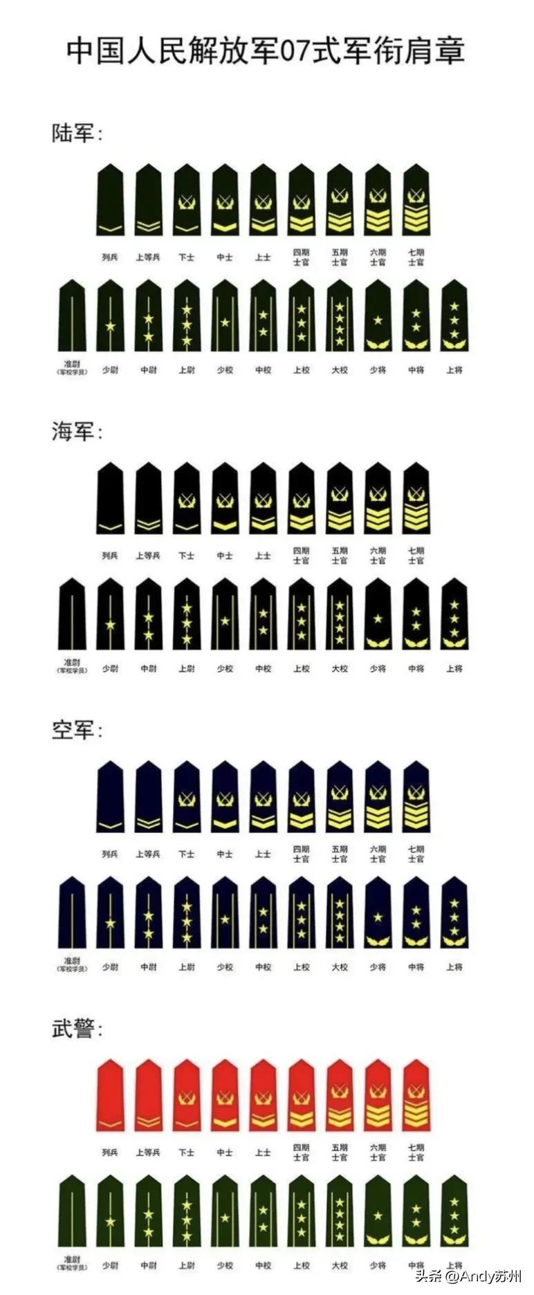 07式军衔相比99式,依旧没什么改动,但新增了七期士官,也就是一级军士长(也就是我们常说的兵王)。
