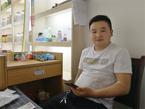 周正龙的儿媳妇在店内打理生意,销售蜜蜂产品,因房租较高,为补贴房租,还销售一些服饰用品。摄影:李子健