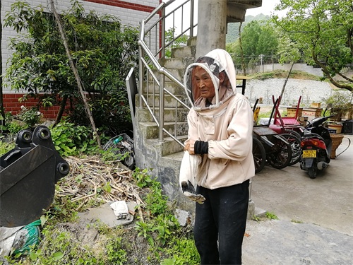 5月立夏过后,天气炎热起来,正是蜜蜂分箱的时候。67岁的周正龙戴上专门的帽子,把脸部遮好,防止蜜蜂分箱时被蜇。