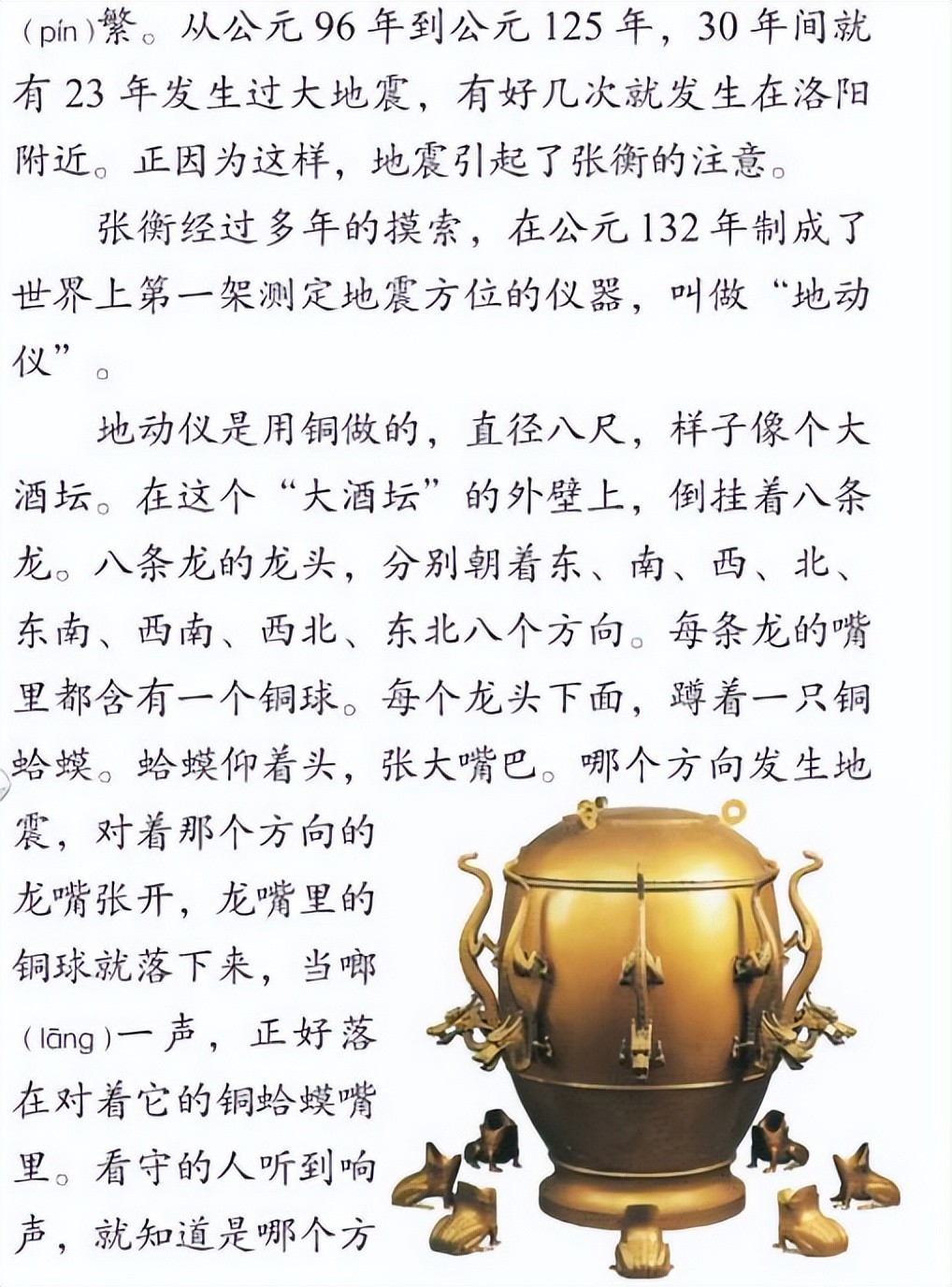 作为发明家,张衡发明了地动仪,这是世界上第一部测定地震的仪器。地动仪用铜铸成,圆径八尺,顶上有凸起的盖子,像个大酒樽;内部有个铜柱,叫作 “都柱”,连着八个方向的机械,外面有八个龙头,按东、南、西、北、东北、东南、西北、西南八个方向排列着。每个龙嘴里衔着一枚铜球,下面蹲着一个铜制蛤蟆,向上张着嘴巴。哪个方向发生地震,那个方向的龙嘴就吐出铜球,落在蛤蟆嘴里,发出清脆的声音,看守仪器的人就能知道地震的日期和方向,把它记录下来。这架仪器测定很准确,有一次,西方龙嘴里的铜球忽然落了下来,而洛阳的人并未感到地动,可是没过几天,甘肃来人报告,说那里发生了地震。这架精巧的仪器是 132 年发明的,比欧洲创造的地震仪要早一千七百多年。此外,他还制作了指南车、自动记里鼓车、飞行数里的木鸟等。