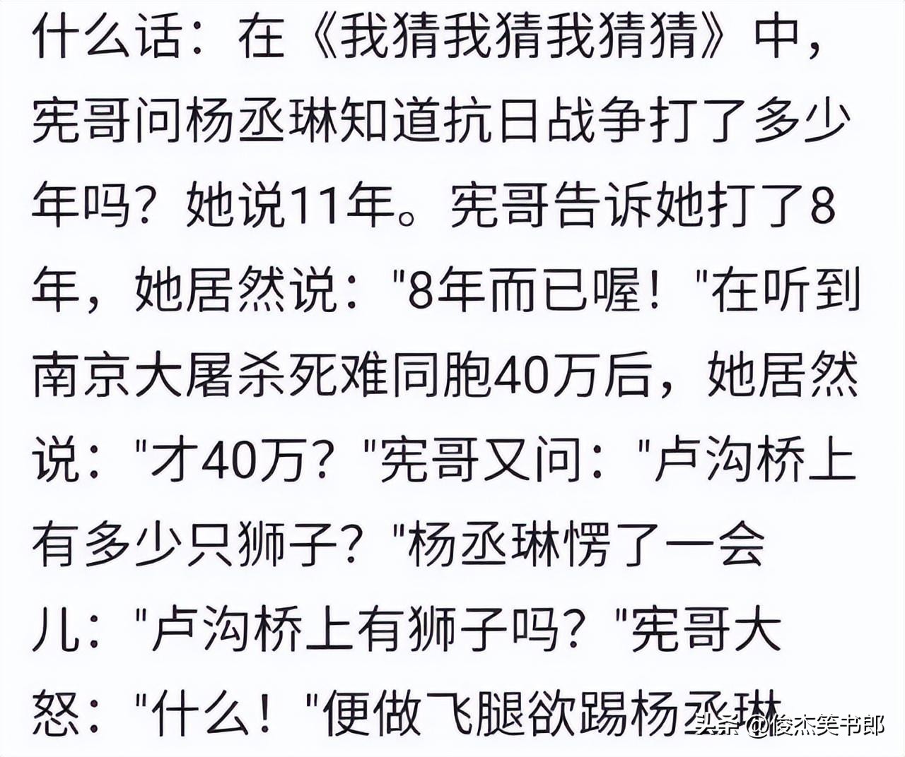 最过分的当属她在综艺节目《我猜我猜我猜猜猜》对“南京大屠杀”和“抗日战争”的傲慢不尊。