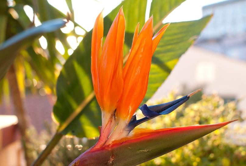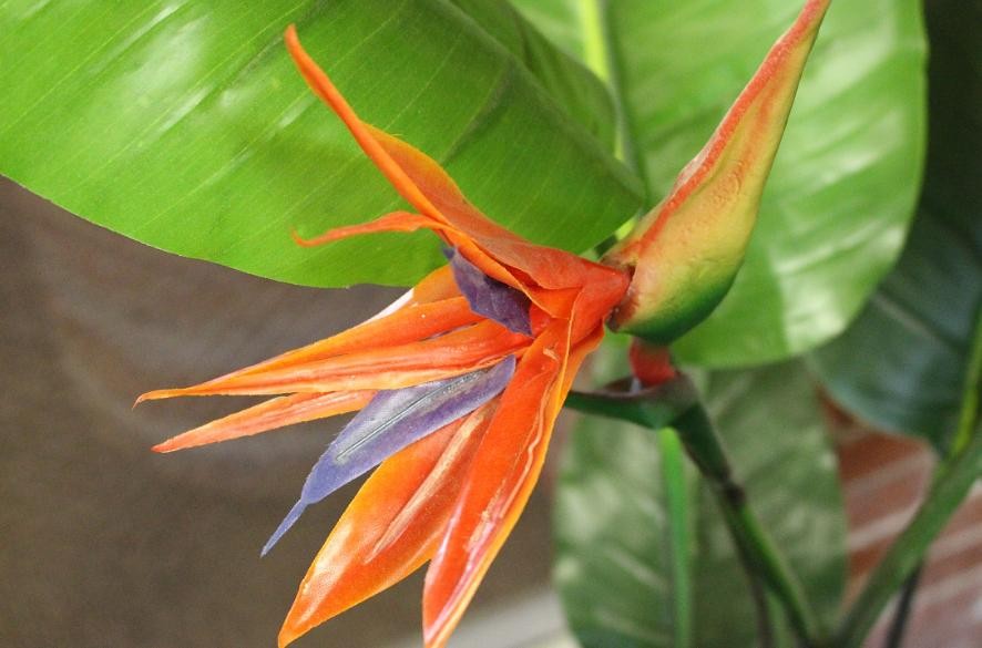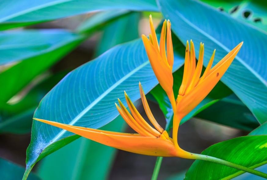 1.花朵:天堂鸟花卉的花朵独特,整朵花呈橙色、红色、黄色等暖色系调,花瓣成舌状,动态展现了一只夸张的小鸟。