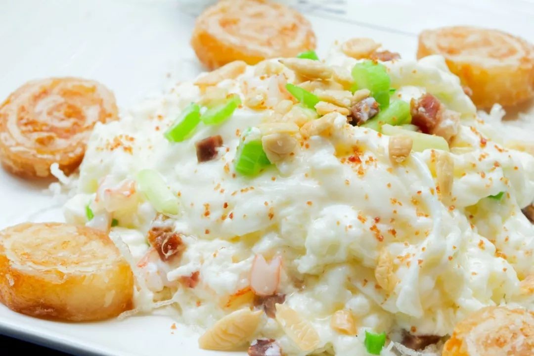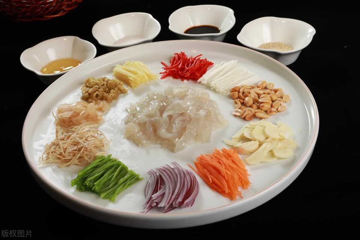 顺德鱼生:以常见的淡水河水鱼为主角,配料丰富,包括蒜片、姜丝、葱丝、洋葱丝、椒丝等,口感层次丰富。