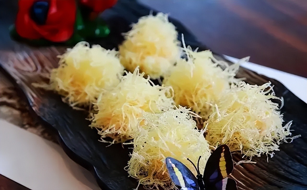 燕奶金丝球:将打好的虾胶包裹燕窝和牛奶做成丸,再拍上脆皮丝,慢油浸炸至熟。