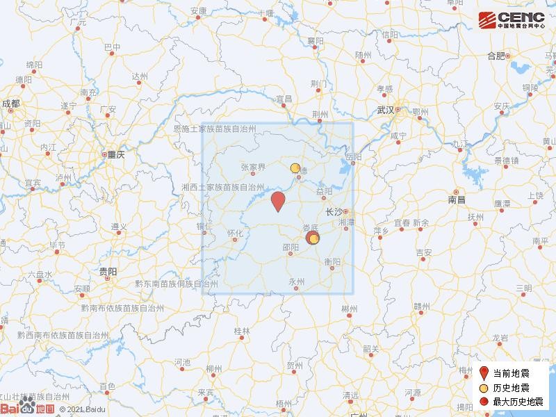历史地震:根据中国地震台网速报目录,震中周边200公里内近5年来发生3级以上地震共4次,最大地震是2019年6月29日在湖南娄底市双峰县发生的3.4级地震(距离本次震中124公里),历史地震分布如图。