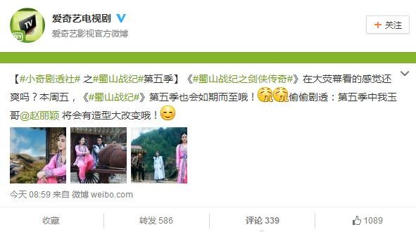 爱豆新闻讯 今日上午,“爱奇艺电视剧”偷偷剧透:第五季中,我玉哥赵丽颖的造型将会有大改变哦!并分享了其中三张粉衣造型剧照。