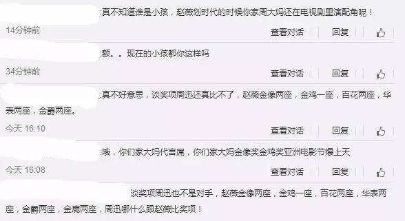 (大意:A:我本命周迅演技和奖项完爆赵薇……B:赵薇划时代的时候你周大妈还在电视剧里演配角呢……)