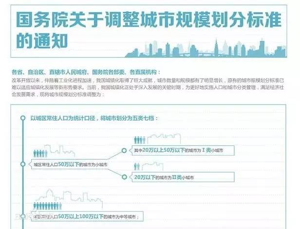 2014年10月,国务院也曾印发一版《国务院关于调整城市规模划分标准的通知》,对原有城市规模划分标准进行了调整,明确了新的城市规模划分标准以城区常住人口为统计口径,将城市划分为五类七档。