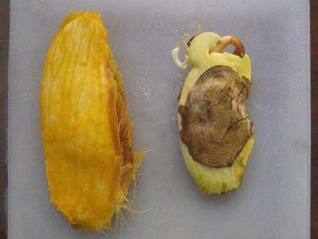 芒果核里面果仁是黄褐色的,表面有一层薄膜,大家可以自己选择是否去掉,可以留也可以不要。