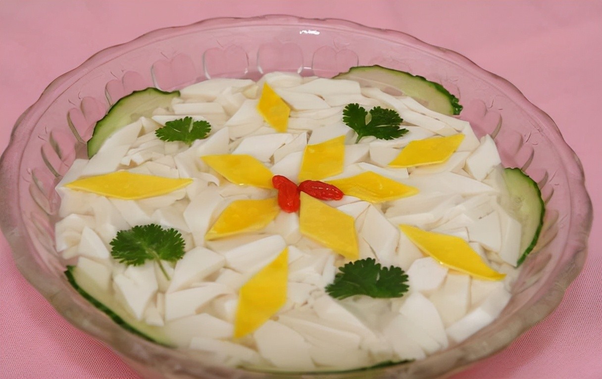 平桥豆腐是江苏省淮安市的一道名菜,属于淮扬菜,选用内有结果豆腐,将它切成一致的菱形小块,配上鸡肉丁、香菇丁、香菜沫,用鲫鱼脑起鲜,吃起来美味可口,肉质细腻又爽滑,又含有丰富的营养,尤其是在夏季食用,味道更不错,深受当地人的喜爱。