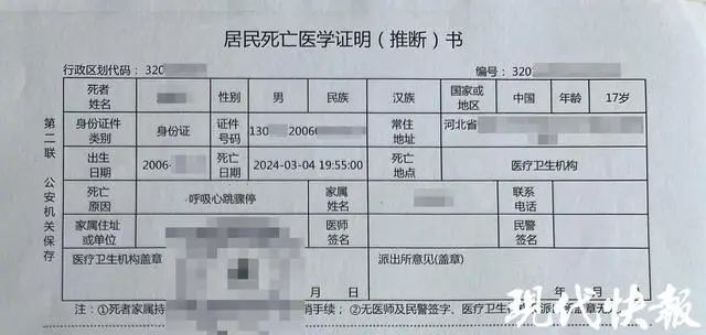 医院在出具的《居民死亡医学证明(推断)书》中明确,小羽死亡原因为“呼吸心跳骤停”。警方在《接处警工作登记表》中写明,法医对尸体进行体表检查,尸体无外伤,毒化检验阴性,排除刑事案件可能。