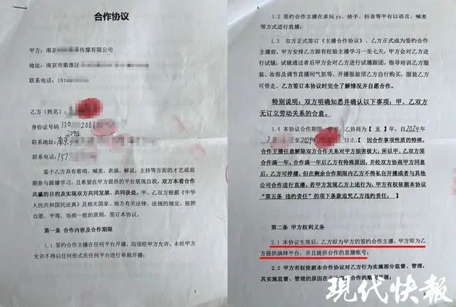 记者注意到,该传媒公司作为甲方,在与乙方小羽签订的《合作协议》中,第二条“甲方权利义务”明确提到,“本协议生效后,乙方即为甲方的签约合作主播,甲方即为乙方提供演绎平台,并且提供合作的直播账号。”