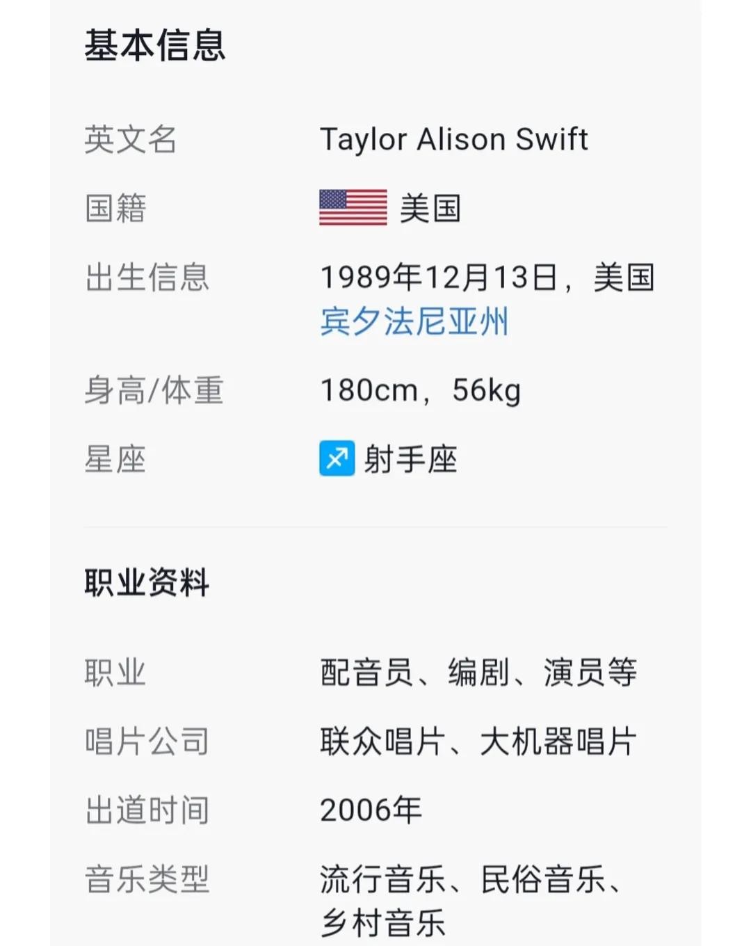 众所周知,泰勒斯威夫特是世界著名的歌手、演员。她1989年12月13日出生在美国,身高180厘米,自从2006年出道以来,已经为大家带来了很多脍炙人口的歌曲,尤其擅长流行音乐、民俗音乐和乡村音乐。由于她高挑的身材,精致的脸庞以及无可挑剔的实力,出道后便迅速俘获了无数的粉丝。她的代表作有《红》《Sparks fly》等。