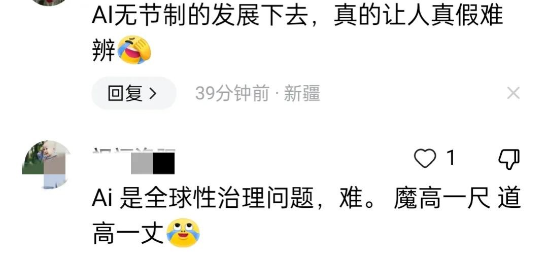 也有网友表示:AI是全球性治理问题,道高一尺魔高一丈,如果任由AI无节制发展下去,真的会真假难辨。