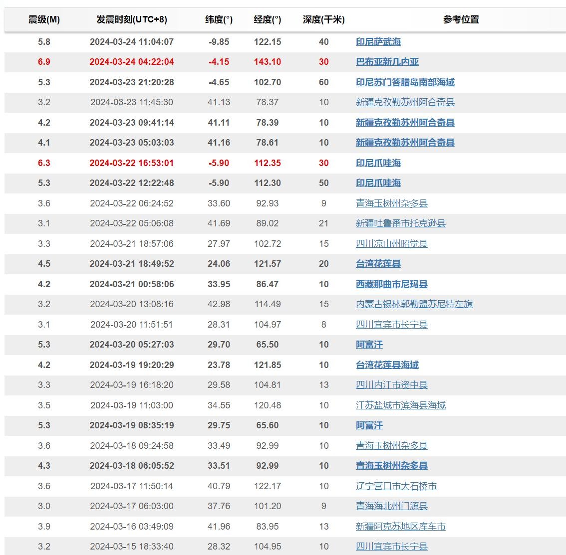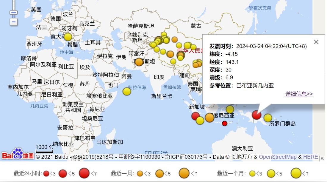 再往前就是2024-03-24 04:22:04巴布亚新几内亚发生了6.9级地震,纬度(°)-4.15,经度(°)143.10,震源深度30千米。
