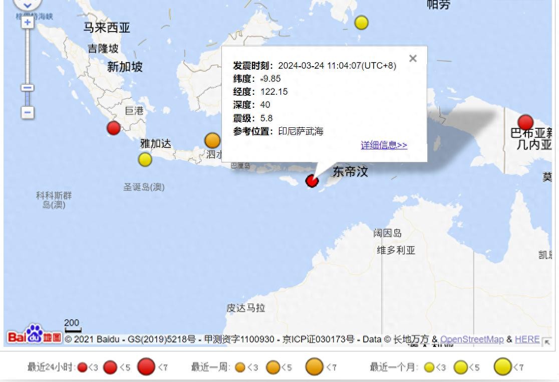 中国地震台网消息,2024年3月24日发生两起地震,最近的是2024-03-24 11:04:07印尼萨武海发生了5.8级地震,纬度(°)-9.85,经度(°)122.15,震源深度40千米。