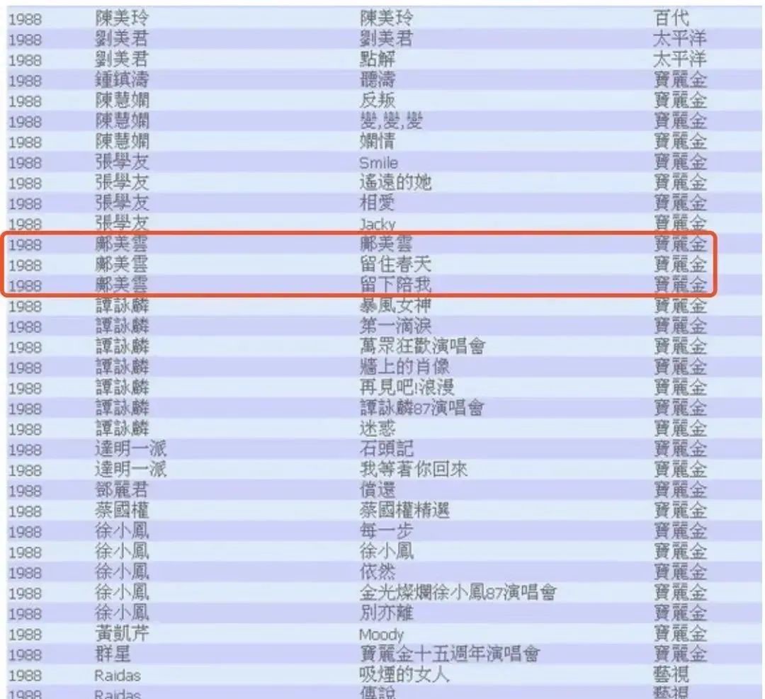 从1985年到1997年,邝美云几乎推出的每张专辑,都是白金销量,最高的《唇印》,直接卖了90万张。