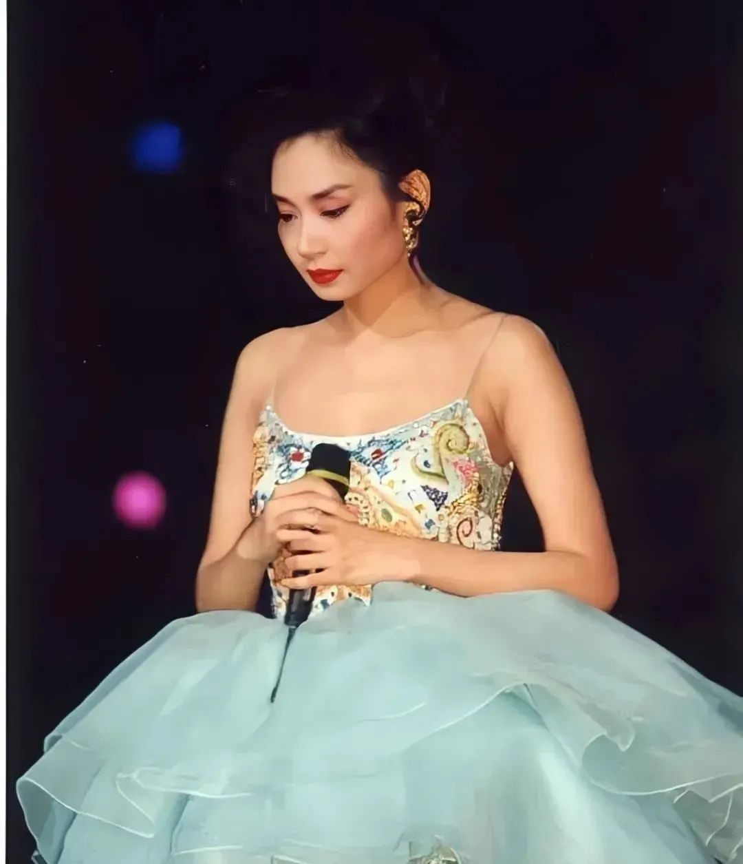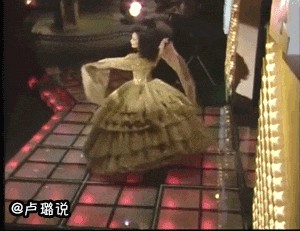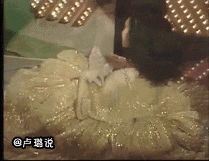 她穿了一身华丽的金色公主裙,烫着当时流行的波浪小卷发,和金色的舞台相呼应,风情万种。