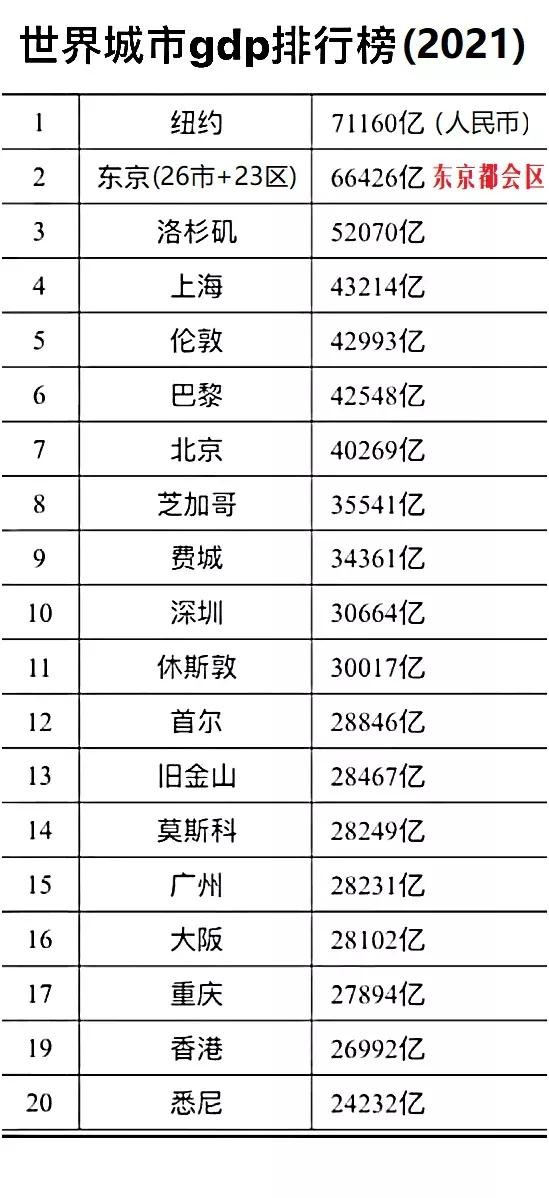 2021年世界GDP总量前20名的城市正式出炉,中美各占6城,日本2城