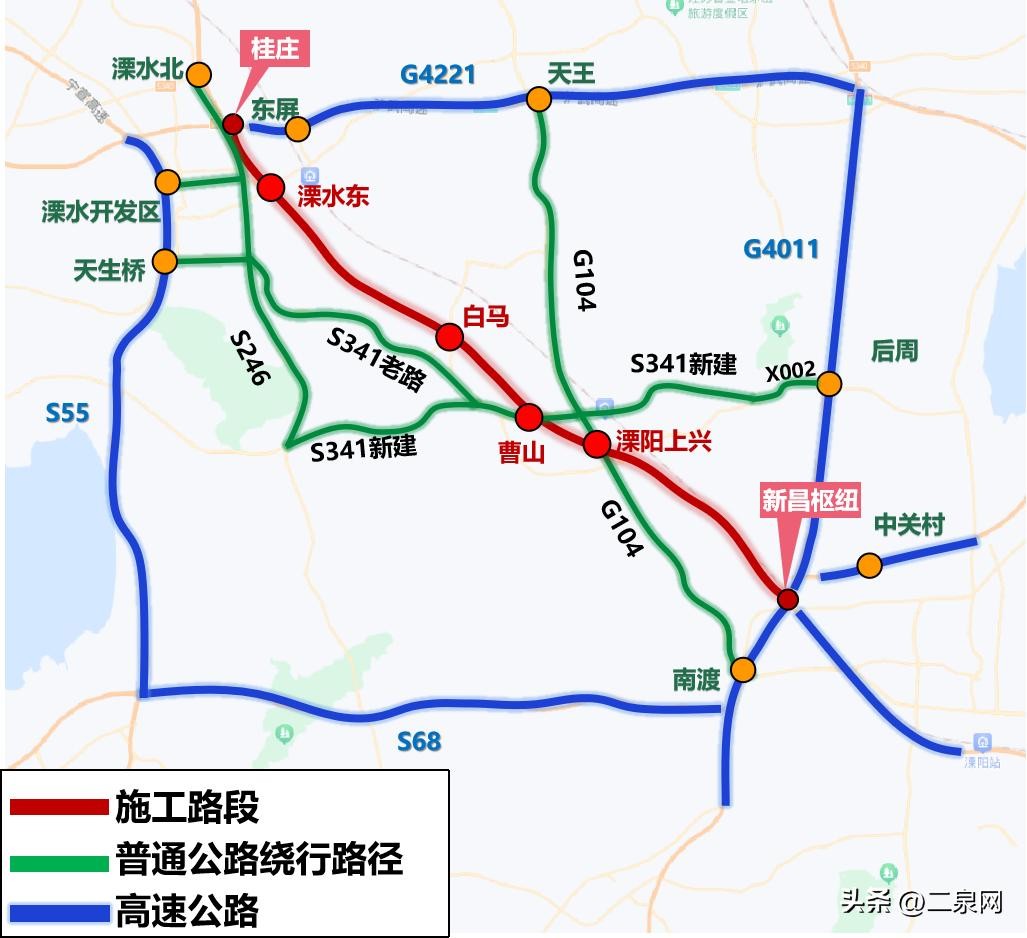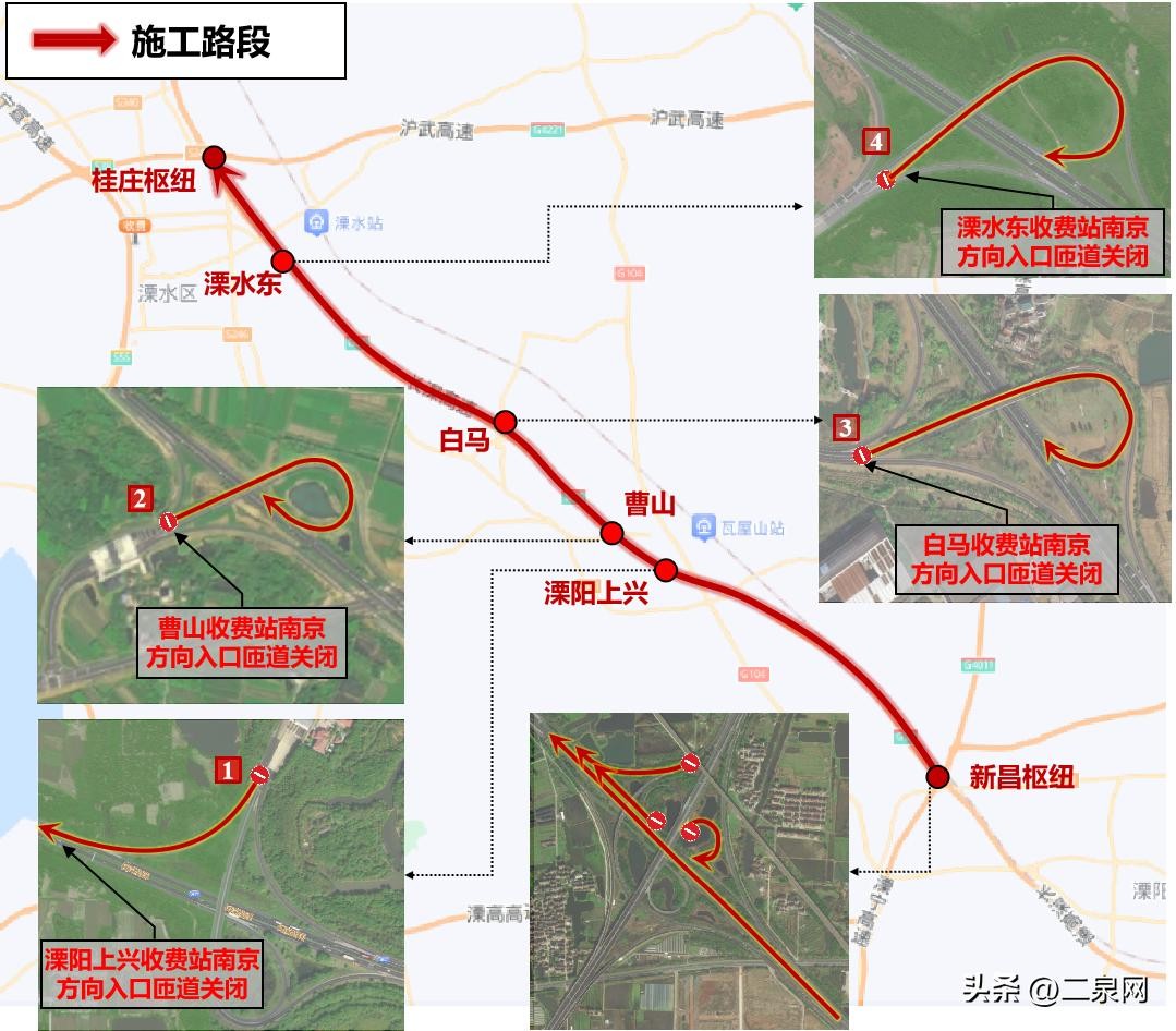 ② 长深高速新昌枢纽-桂庄枢纽南京方向主线匝道封闭③ 新昌枢纽G4012溧宁高速镇江方向转G25长深高速南京方向出口匝道封闭④ 新昌枢纽G4011扬溧高速杭州方向转G25长深高速南京方向出口匝道封闭