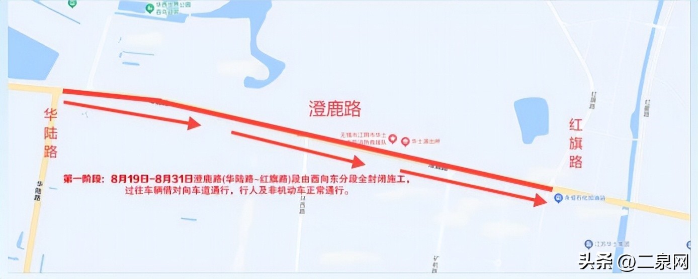 8月19日—8月31日,澄鹿路(华陆路~红旗路段)由西向东分段全封闭施工,过往车辆借对向车道通行,行人及非机动车正常通行。